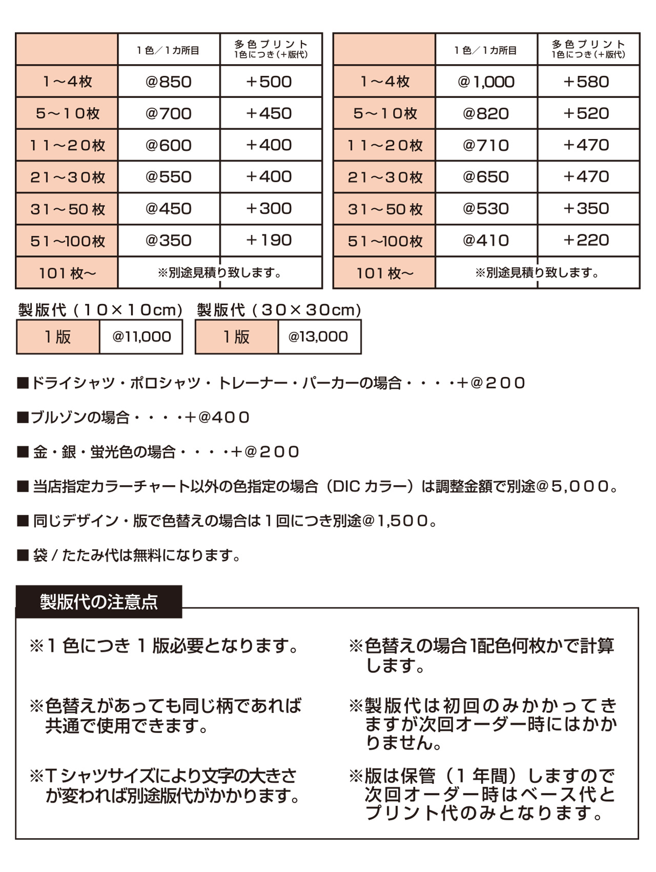 ※下記のプリント料金は1枚辺りのプリント料金になります。