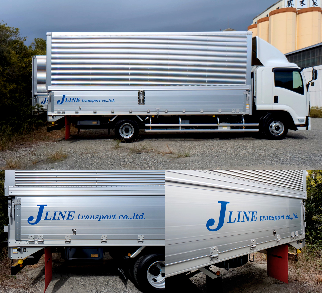 ※こちらは貝塚市の運送会社「株式会社ジェイライン」さんからで、以前ポロシャツやブルゾン製作で依頼いただいてたのですが、今回はトラック6台(左右)に社名を入れたいということで貼ってきました。トラックは1度にまとめては無理なので(配達に行っているので) 、2日に分けて(別日)貼りましたよ。