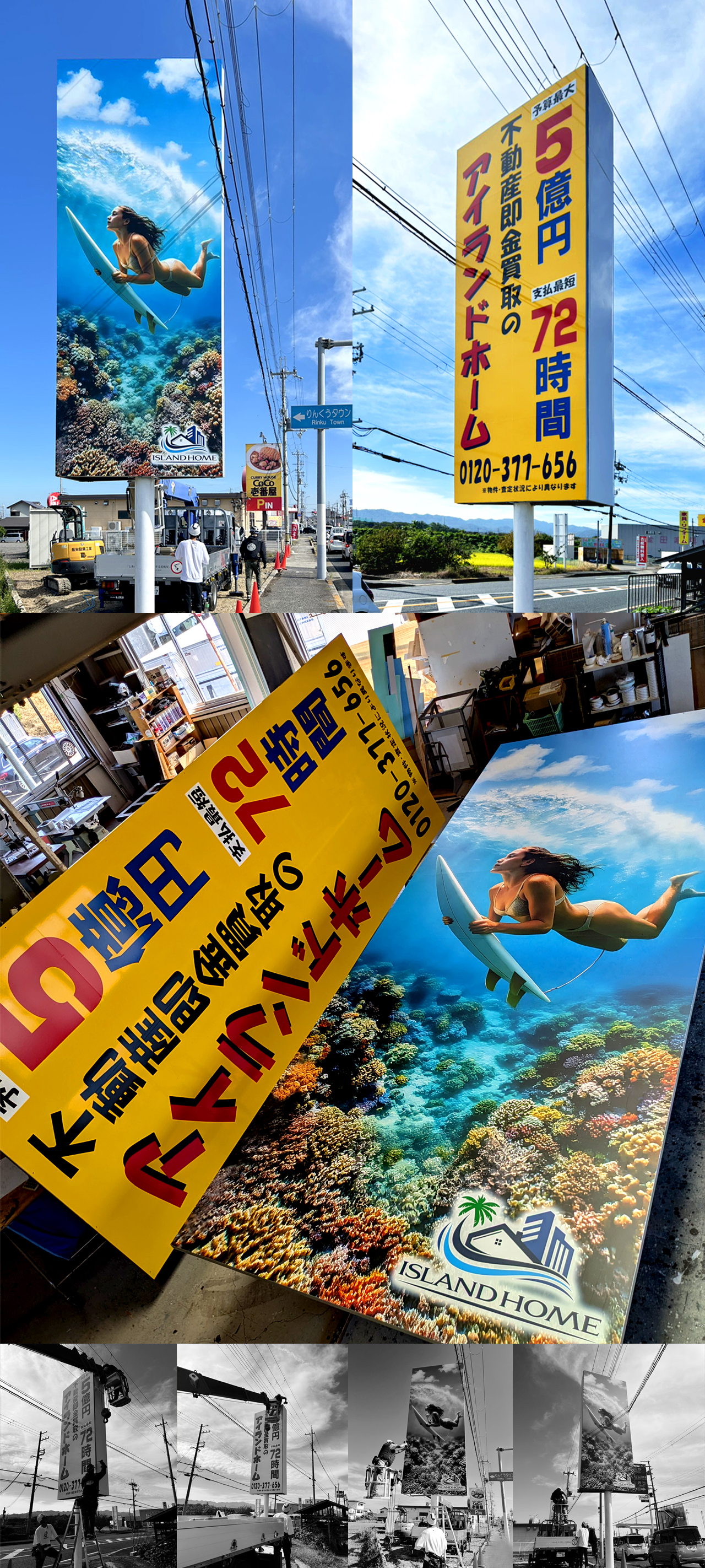 ※こちらはいつもお世話になっている泉南市の不動産コンサルタント会社の「株式会社 アイランドホーム」さんからで、何度か製作している自立看板の依頼でした。ただ今回は片面を先日のサーフィンデザインVerでお願いしたいということで、片面は新規データで製作しました。