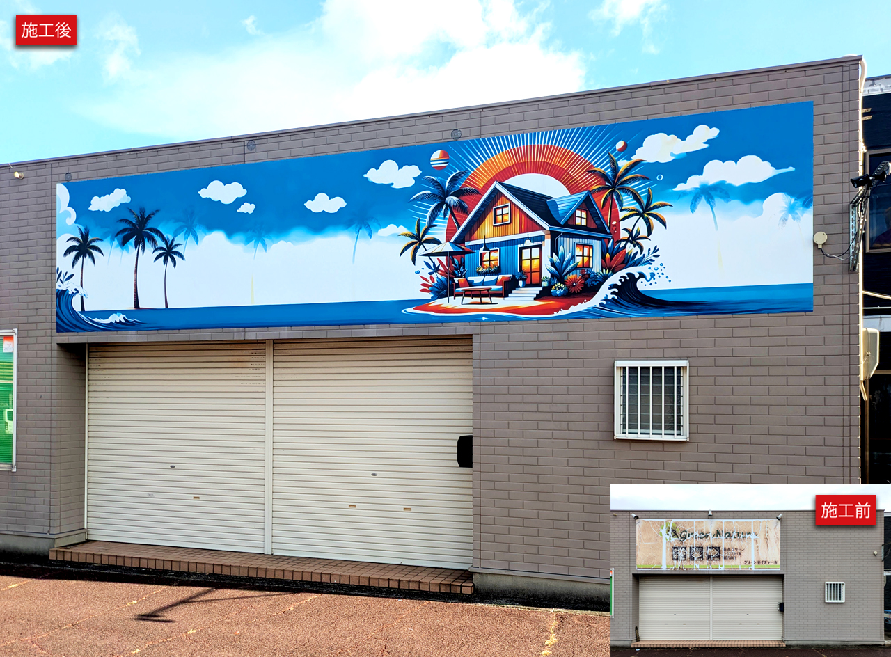 ※こちらはいつもお世話になっている泉南市の不動産コンサルタント会社の「株式会社 アイランドホーム」さんからで、今回は事務所横の壁面にイメージのイラストの看板を設置したいということで、イメージ画像から一部生成AIを使用してデータを製作しました。いい感じに仕上がりましたよ。