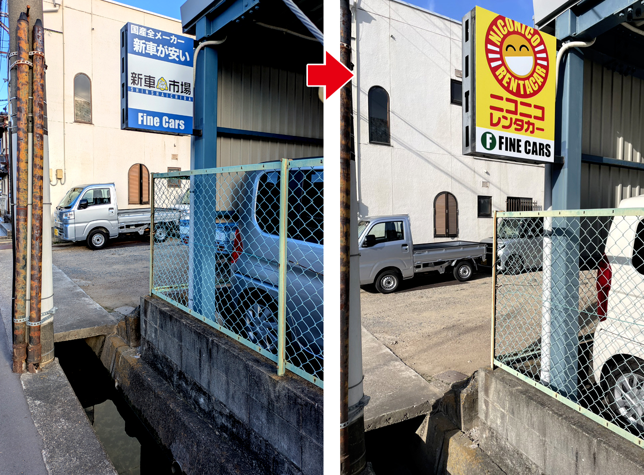 ※こちらは以前依頼をいただいた近所の中古車販売店 「Fine Cars(ファインカーズ)」さんからの看板の依頼で、以前から設置済みの看板が古い情報だったので最新のニコニコレンタカーに変更して設置させていただきました。